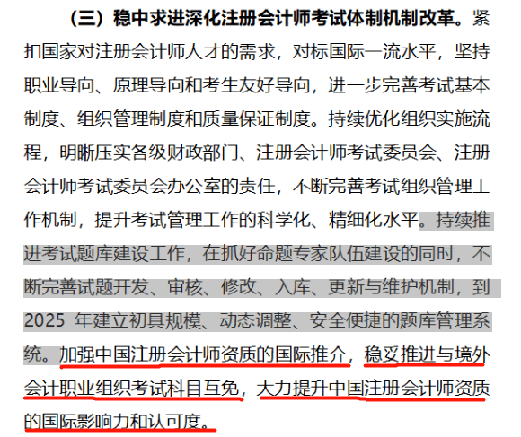 指导意见中多次提及加强注册会计师资质的国际推介,稳妥推进与境外会计职业组织考试科目互免,大力提升中国注册会计师资质的国际影响力和认可度。