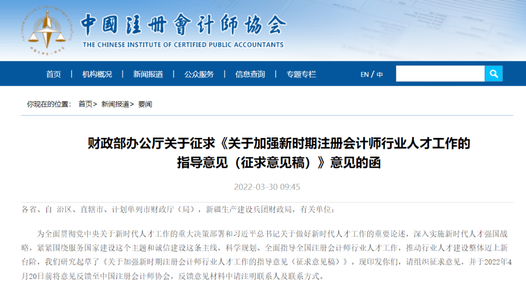 早前,中注协转发了财政部关于征求《关于加强新时期注册会计师行业人才工作的指导意见(征求意见稿)》意见的函。